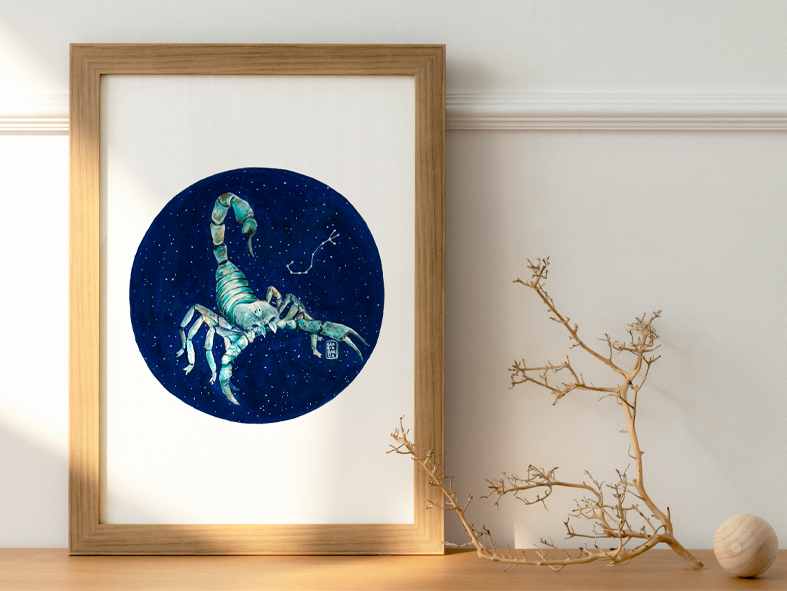 La lámina Escorpio forma parte de la serie “Astrología”. Escorpio es un signo de agua con una poderosa, pero misteriosa personalidad. Son intensos, a la vez que sensibles, intuitivos y con una profunda conexión emocional.