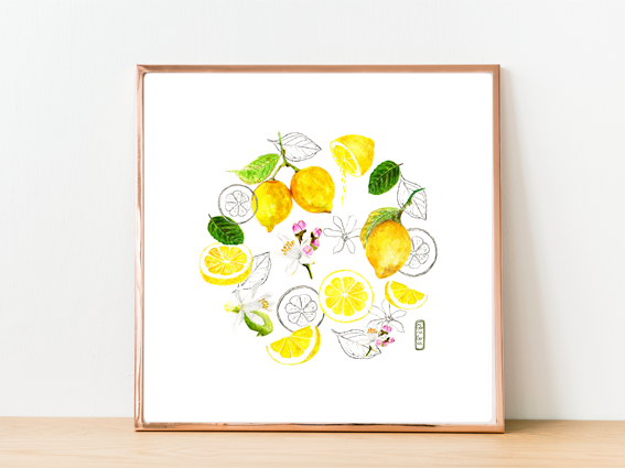 La lámina Limones es una reproducción del dibujo original, creado en acuarela, lápices y grafito.